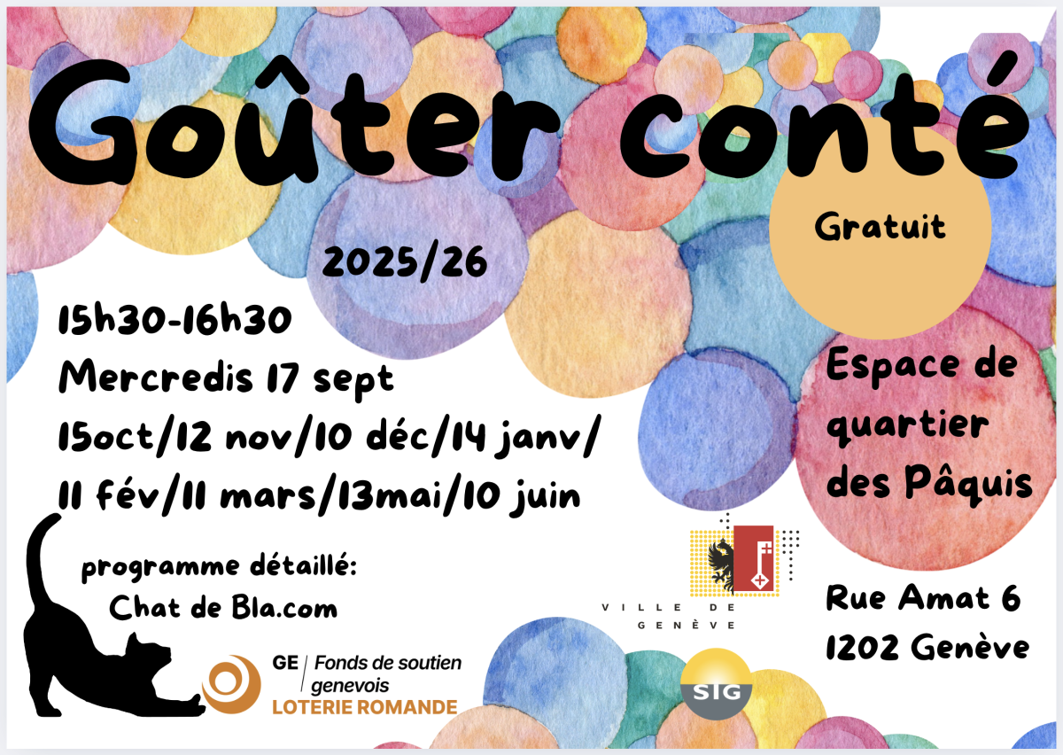 Ouvrez grand vos oreilles ! Les conteur.euse.s du Chat de Bla viennent chaque mois ( 10 fois par année scolaire) proposer leurs histoires à l’Espace de quartier des Pâquis ainsi que les seconds dimanches du mois au Centre Culturel des Grottes.
